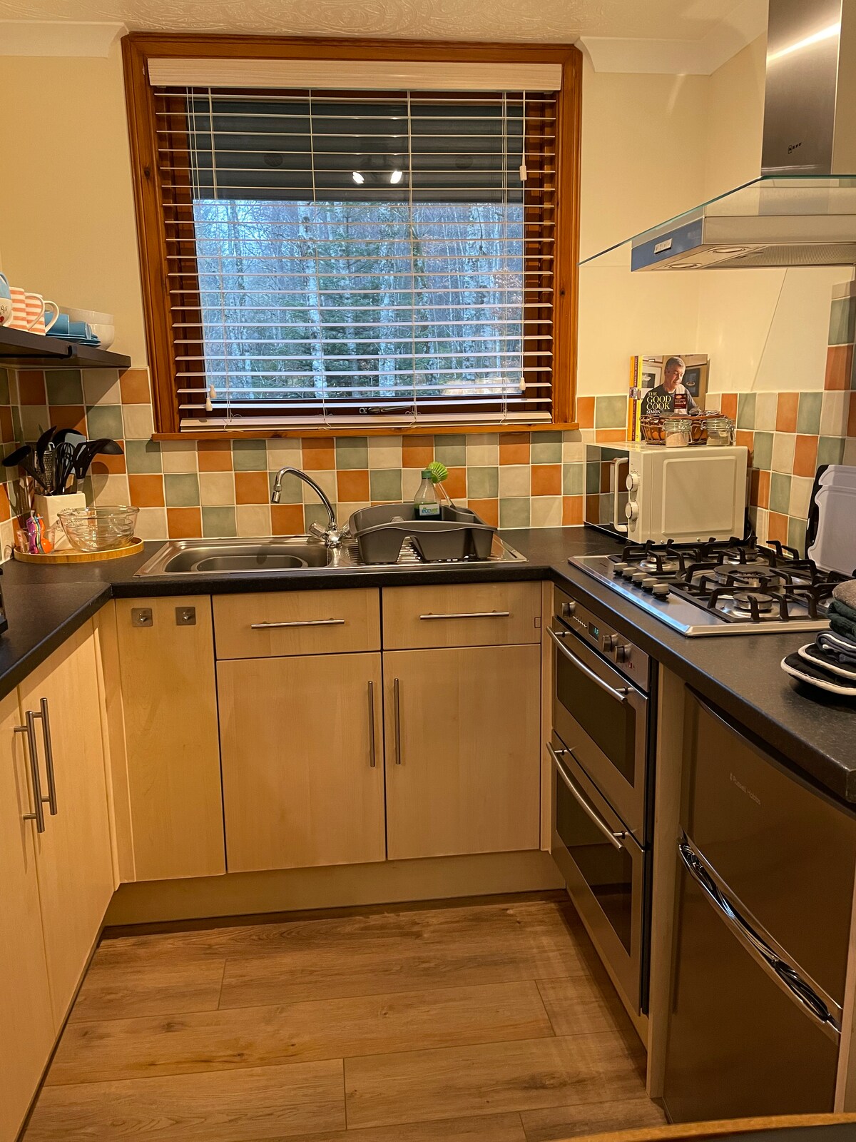 The Cabin is a self catering one room chalet that contains 2 single beds, table, chairs, armchairs and a kitchen. An enclosed bathroom with shower, toilet and sink is included. Water is provided by the Cromdale hills via filtration system. The Cabin is fully insulated and heated for a cosy environment. Entertainment consists of TV, video & bluetooth boom bar speaker. Placement of The Cabin is close to the back of the house which provides privacy for guests. WiFi is available.