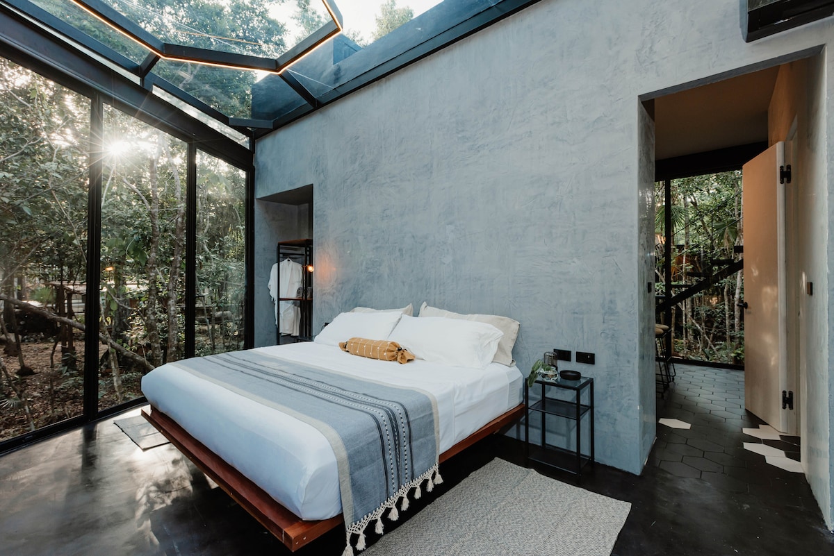 Prepustite se edinstvenem in nepozabnem doživetju! Bivajte v razkošnem stanovanju s steklenimi stenami ter uživajte v osupljivem razgledu in sodobnem udobju v osrčju džungle. Naše studio stanovanje je kot nalašč za samostojne popotnike, digitalne nomade ali pare, ki se želijo sprostiti in ponovno povezati. Steklene stene od tal do stropa prepuščajo naravno svetlobo in toploto sonca... in se celo odprejo, da sprostijo vetrič v džungli! Soba ima kuhalno ploščo in mini hladilnik. Po dolgem dnevu si privoščite našo deževno prho in udobno veliko zakonsko posteljo!