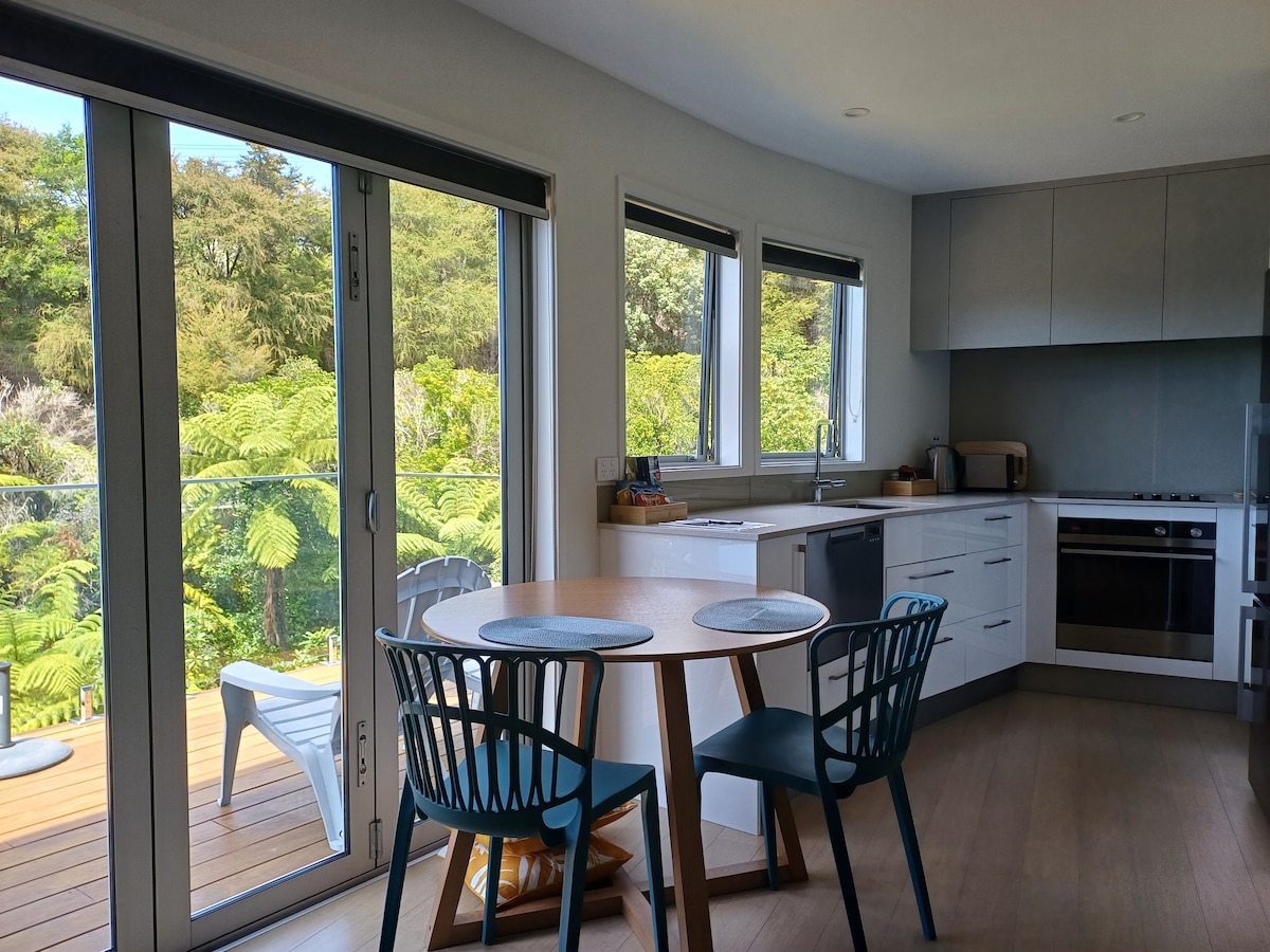 Nahaja se v grmovju in popolnoma ločeno/zasebno od glavnega stanovanja boste našli na novo predelano enoto. Sodobna, popolnoma izolirana, dvojna zastekljena in udobna toplotna črpalka. Lasten vhod, zasebno dvorišče in pod pokritim zunanjim prostorom. 10 minut hoje do plaže Kaiteriteri, gorskega kolesarskega parka in osupljivega narodnega parka Abel Tasman na vašem pragu. Poslušajte ptičje petje v osupljivem domačem grmu, uživajte v razgledu na ustje do plaže Kaiteriteri. Zaupajte nam, da ne boste želeli oditi.