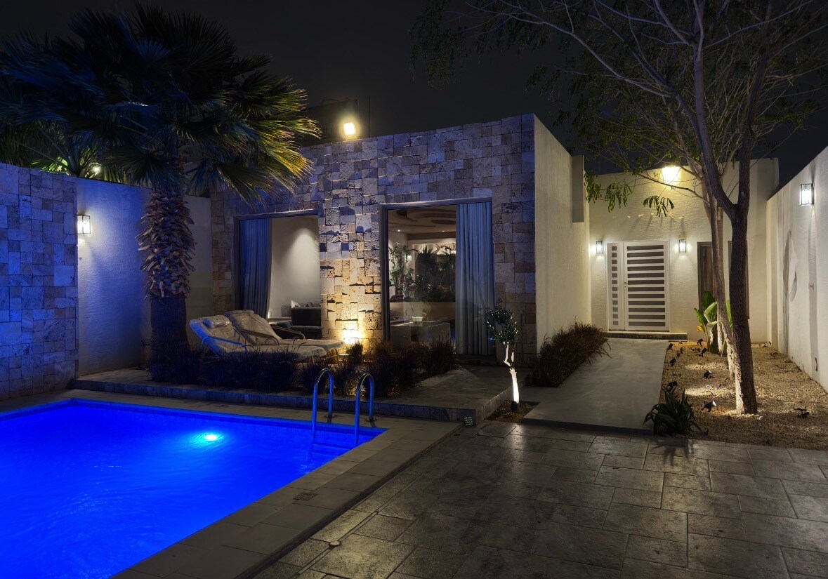 Minimalistična koča z zasebnim bazenom in zunanjim salonom