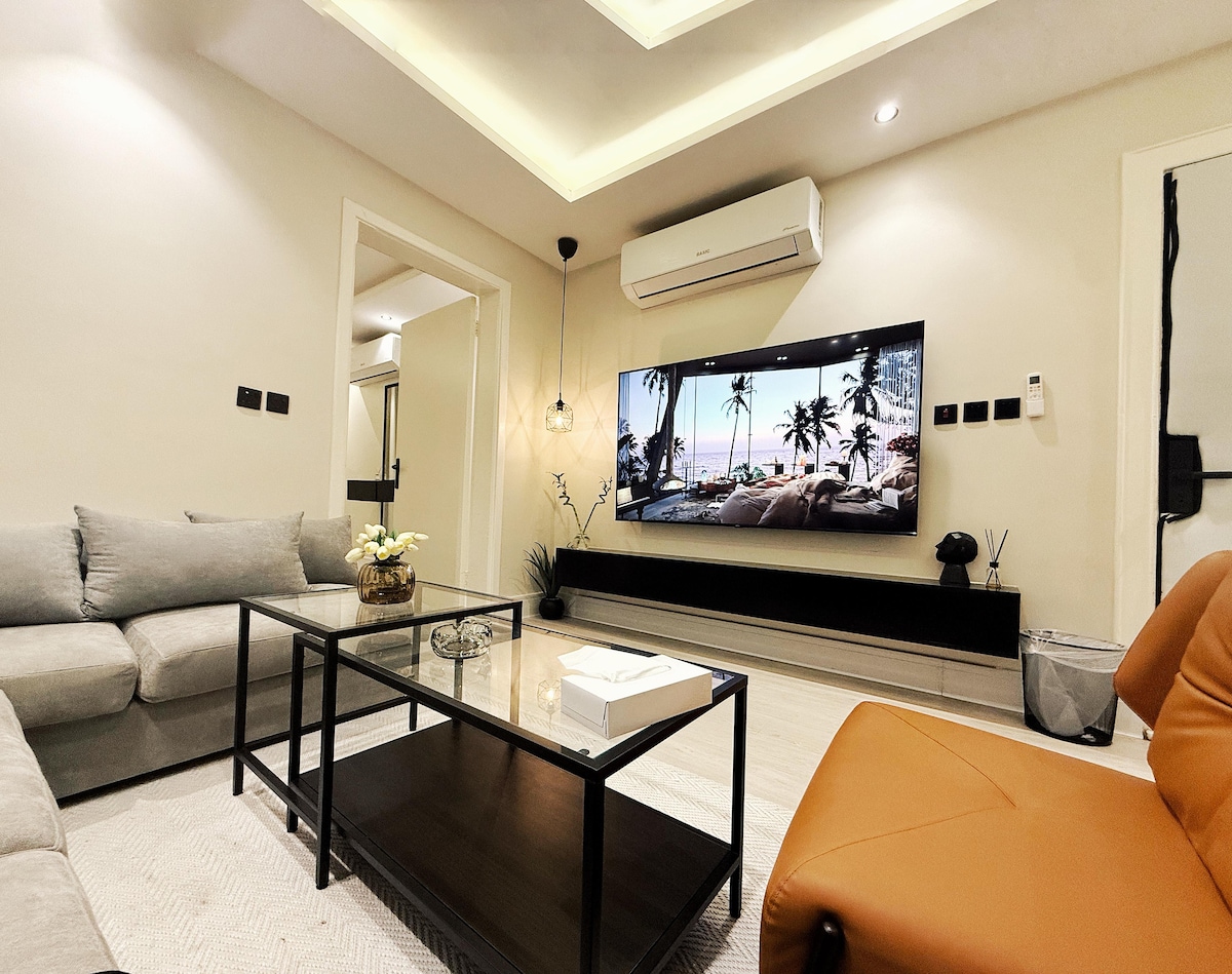 Doživite edinstveno doživetje v zasebnem prenočišču 1BR, ki ponuja sprostitev in udobje. Stanovanje vključuje posteljo in dnevni prostor, kjer lahko uživate v gledanju na 65-palčnem pametnem zaslonu. Na voljo sta tudi ločena kuhinja in kava za vse vaše potrebe. lokacija je v bližini vseh storitev, turistične destinacije in območij sezone v Rijadu (Boulevard City World, Kingdom Dome Arena in druga gledališča) v 5 minutah. Radi bi vas sprejeli in delite izkušnje z nami.