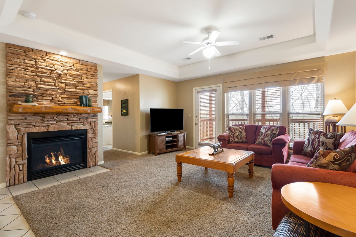 This relaxing, family-friendly condo in the gated, Holiday Hills Golf Resort sleeps 6, has a full kitchen, arcade machine, luxurious jacuzzi tub, smart TV’s in every room, and a walk out patio. The golf course, literally steps away, makes a beautiful backdrop for a morning coffee on the patio. Resort amenities include multiple outdoor swimming pools, activity center w/ game room, restaurant and more. Minutes away from Taneycomo lake, Branson Landing, and the famous Branson Theater District.