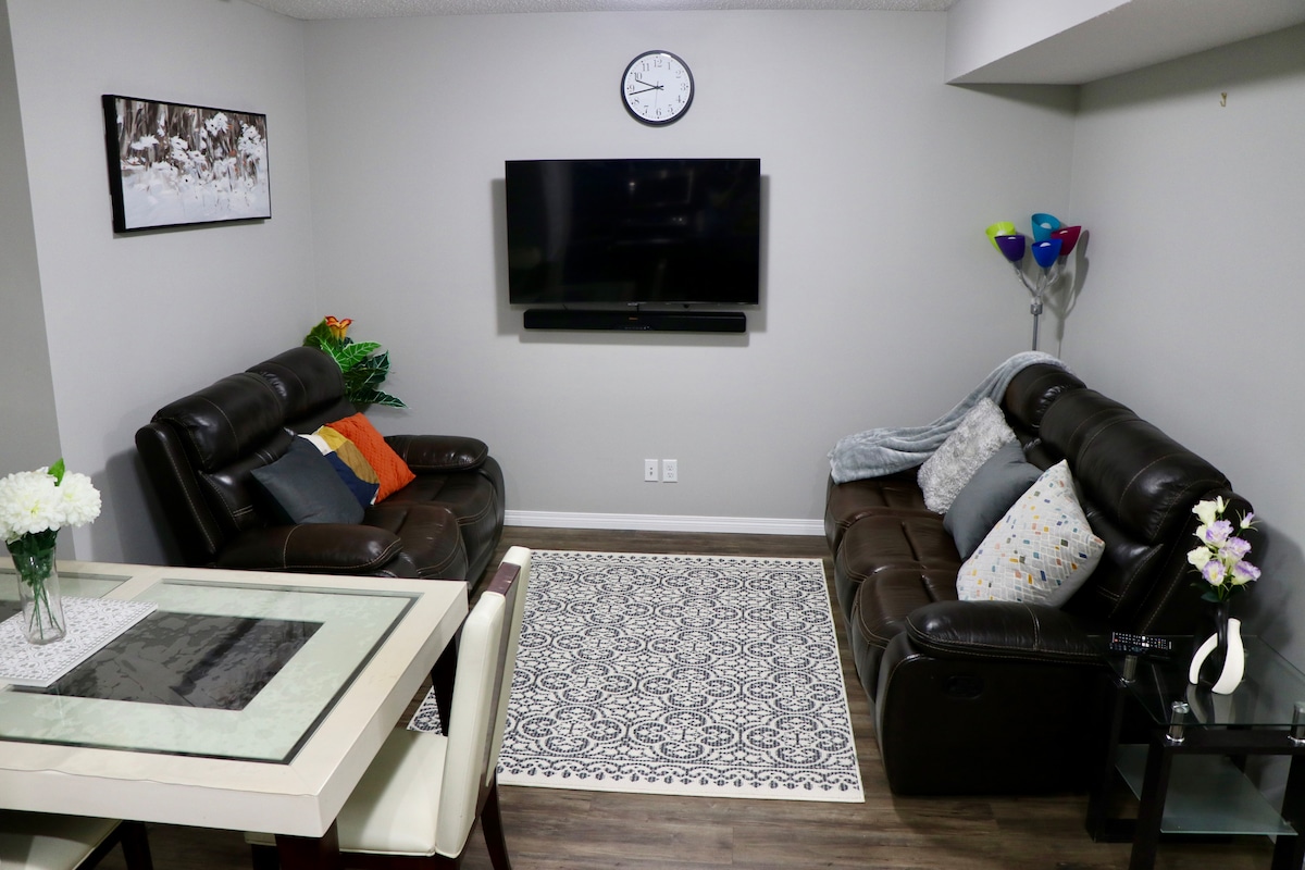 Enjoy a stylish experience at this centrally located suite. Uniquely designed with your comfort in mind. A cozy suite with close proximity to the airport, bus stops and other essential amenities. 3 minutes walking distance to grocery stores, restaurants etc. Free parking, private entrance, self check-in, full kitchen, In-suite laundry, dedicated heating, dimmable lighting, 75" smart cinema TV, Netflix, Fire TV, Xbox console, Board games, office space, books, complimentary drinks & snacks, etc.