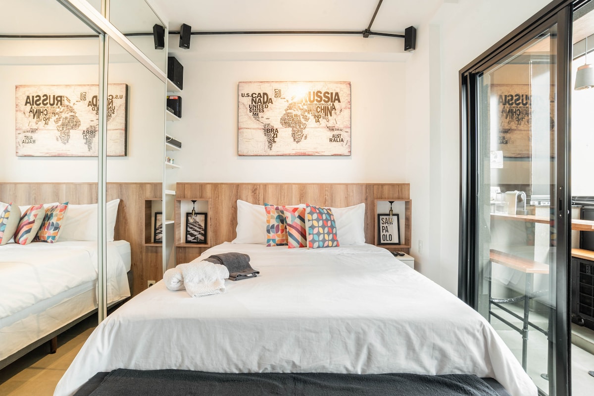 Uživajte v São Paulu na neverjetni lokaciji s polno opremo za prosti čas, brezplačnim parkiranjem, fantastičnim bazenom in telovadnico na strehi, delovnim prostorom in samopostrežno trgovino z živili. Fit industrial style built to provide comfort 20m from Oscar Freire and 1 minute from Metro Oscar Freire. Uživajte v najboljši stavbi v regiji. Stanovanje ima popolnoma opremljeno kuhinjo, Wi-Fi, aparat za kavo, opekač kruha, Nespresso, likalnik, sušilnik za lase, lonce in ponve. Uživajte tudi v posteljnini Buddenmeyer in veliki prhi