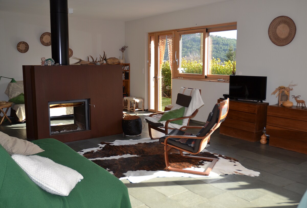 Architect house built in wood and glass nestled at 1000m altitude at less than 3 hours from London (1h from Carcassonne airport). Wide windows and large deck to enjoy spectacular views of the mountains and meadows. Ideal setting for savoring the seasons: hiking, mountain bike, mushrooms, deer slab ... or just contemplate the amazing landscape. With all the comfort and a "nomadic" decor, the interior life is organized around the large central fireplace. Garden and orchard for siestas and grills