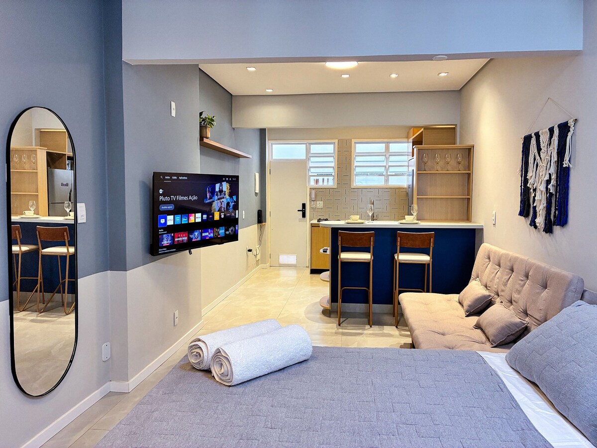 Sodobno, nedavno prenovljeno in brezhibno garsonjero. Prostor ima udobno zakonsko posteljo, raztegljiv kavč, klimatsko napravo z močjo 18.000 BTU, pametno televizijo, popolnoma opremljeno kuhinjo za vsakodnevne obroke ter veliko in dobro opremljeno kopalnico, ki zagotavlja udobje in funkcionalnost. Ima poseben prostor za delo/dom, ki je idealen za tiste, ki potrebujejo delo na daljavo. Nahaja se v Botafogu, le 5 minut hoje od podzemne železnice, s hitrim dostopom do Copacabane, plaž, restavracij in celotnega mesta.