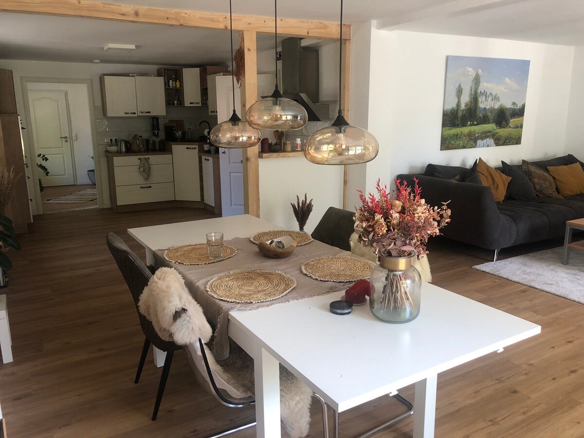 Zatočišče se nahaja na koncu vasi, na mirni in čudoviti lokaciji sredi narave Mecklenburga neposredno v biotopskem gozdu. Nahaja se le 2 uri stran od Berlina in Hamburga. Stanovanje sem zasnovala z veliko ljubeznijo in ustvarila fuzijo različnih slogov. Med prenovitvenimi ukrepi je veliko starih sestavin je postal viden, na primer stari naravni toni lesa, polovične in glinene stene. Lepota nepopolnosti in prehoda