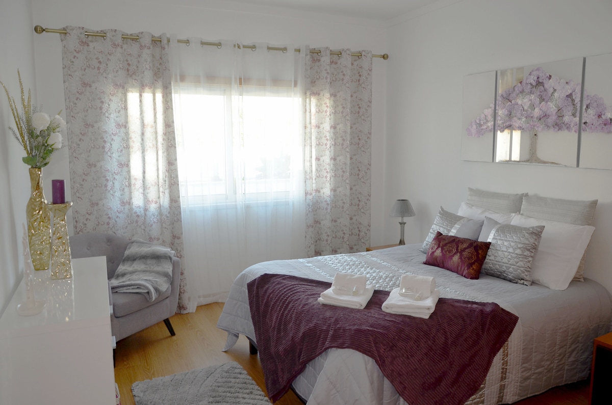 O apartamento é composto por 2 quartos com ar condicionado. 2 casas de banho, sala com ar condicionado, WIFI, TV cabo e cozinha equipada com máquina de lavar roupa e loiça, micro-ondas, placa e forno, jarro elétrico, torradeira e máquina de café. Varanda com mesinha e cadeiras. Localizado no 3.º andar, dispõe de elevador. A decoração moderna, em tons neutros, com muita luz natural, conferem ao espaço um ambiente acolhedor que convida ao descanso, garantindo uma estadia inesquecível.