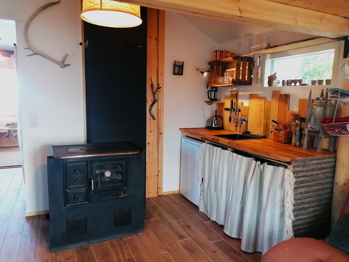 Log cabin with a lakeside view. Features include a private sauna, one bedroom, and a sleeping house located outside the main cabin. The living room and kitchen are combined. A BBQ place is located on the front yard. Water toilet. Shower and tap water filtered from lake. A boat is available for free use. Activities: wildtaiga site. Hot tub / extra fee 90€.