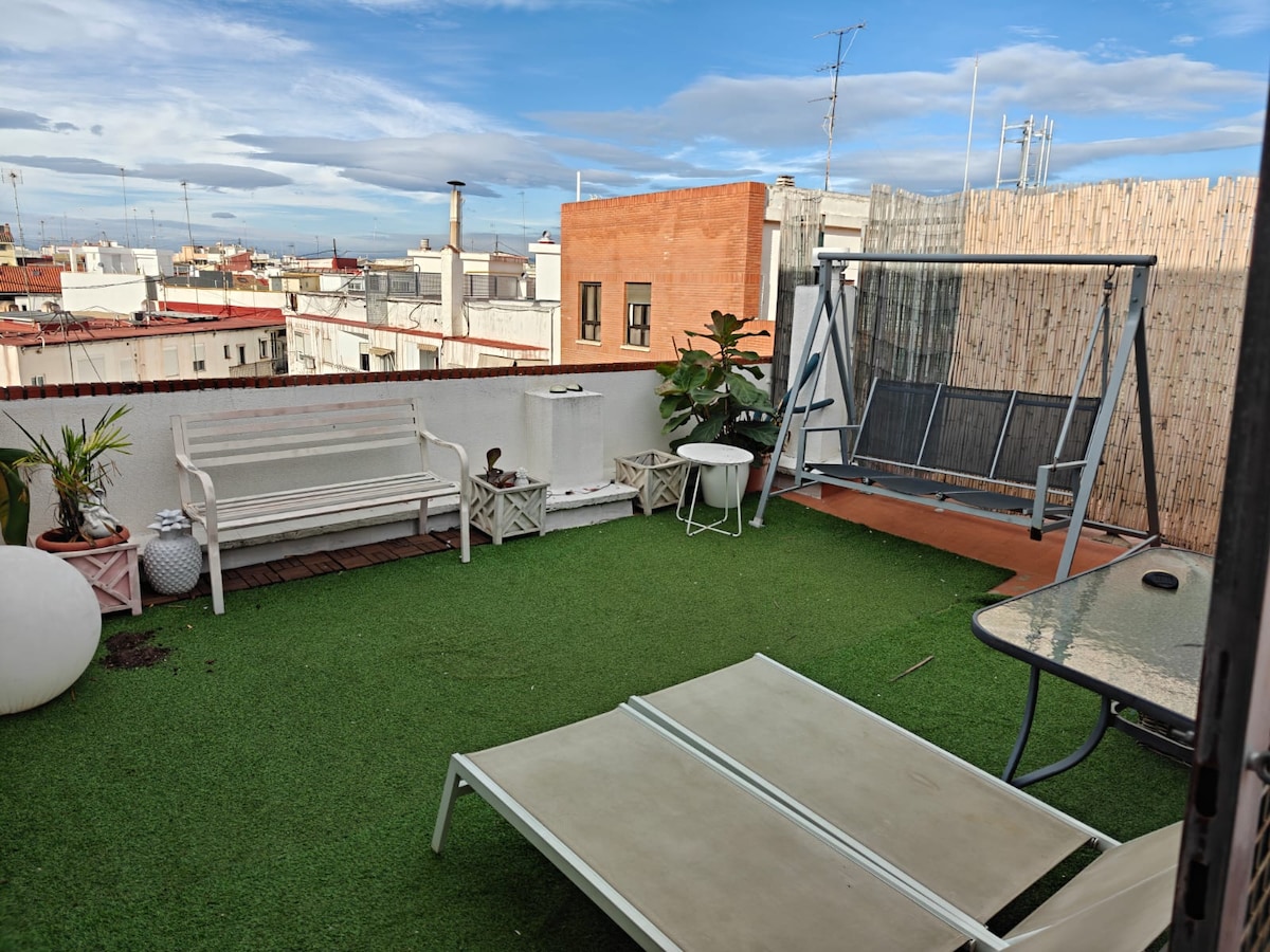 Čudovit penthouse s teraso, svetlo in prostorno, ki se nahaja v osrednji soseski Mercado de Abastos, le 8 min hoje od zgodovinskega središča Valencije. To stanovanje je bilo popolnoma prenovljeno, hkrati pa je ohranilo ves svoj značaj in svetlobo. Ima dve spalnici, raztegljiv kavč in impresivno zasebno teraso, ki zagotavlja popolno bivanje za uživanje v Valenciji Popolnoma povezan in opremljen z vso opremo, vključno z brezplačnim brezžičnim internetom.