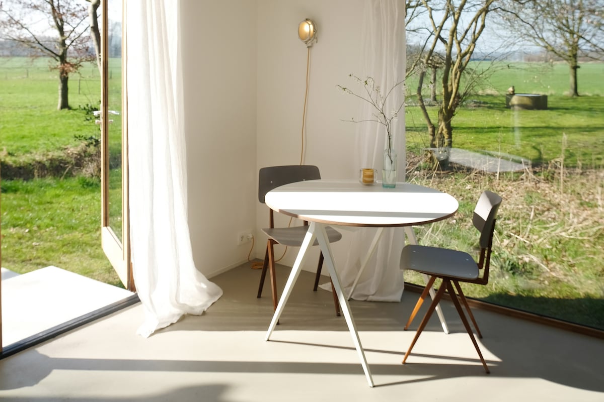 Naša koča se nahaja za našo hišo v bližini naravnih rezervatov Haaksberger- in Buurserveen. Naravni bazen v bližini. Uživajte v mirni okolici ter čudovitih sprehajalnih in kolesarskih izletih. Cena savne na zahtevo. Z verande se razprostira čudovit razgled na travnike in lesene valove. Soba lahko sprejme 1 ali 2 osebi. Za majhen honorar si lahko sam prižgeš taborni ogenj. Na voljo je žar na premog. Uporaba lastnih kuhalnih aparatov ni dovoljena.