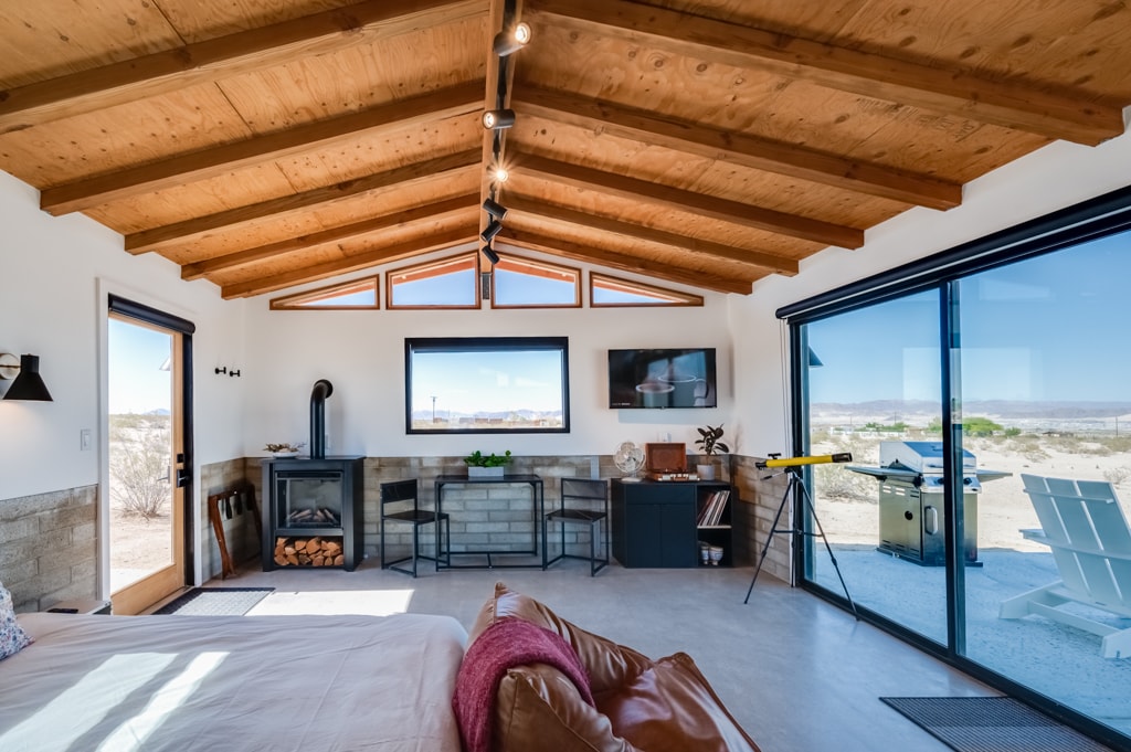 The Rum Runner. A modern take on the classic desert homesteer. Posebnosti vključujejo: - Vroča kad -BBQ Grill -Tesla Charger - Več ognjišč -Parachute Posteljnina Zvočni sistem -Sonos -Endless Desert Views - Več kavbojskih kadi - Popolnoma opremljena kuhinja - Dnevna postelja za opazovanje zvezd na prostem - Velika senčna terasa z jedilnico na prostem - Sun Room with 8x20’ Retractable Glass Wall - Notranji mural, ki ga je zasnovala lokalna umetnica Ana Digiallonardo