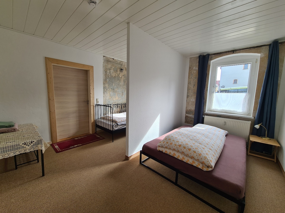 Novo in skrbno opremljeno stanovanje s površino 61 m² vas sprejme v osrčju naravnega parka Saale-Unstrut-Triasland. Ljubitelji narave in vadbe se lahko tukaj sprostijo in najdejo sprostitev med pohodništvom in kolesarjenjem. V toplejši sezoni lahko uživate v vinski regiji na reki White Elster. Ne glede na to, ali gre za samostojne pustolovce ali pare (z otroki in brez njih)- vsi so dobrodošli v našem »malem raju«! Na voljo vam je hišna infrardeča savna.