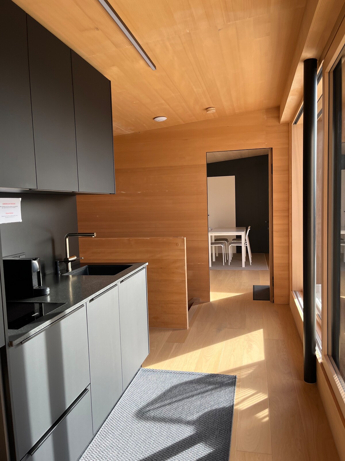 Ob vstopu v planinski dom vas bo pričakalo toplo, vabljivo vzdušje z ljubkimi alpskimi detajli – ravno prav tam, kjer se lahko sprostite in pustite vsakdanje življenje za seboj. Odprta dnevna soba združuje sodobno udobje z regionalnim šarmom: udobno se namestite na velikem kavču, uživajte v razgledu na okoliške vrhove ali se sprostite ob filmu na pametnem televizorju po dnevu v gorah.
