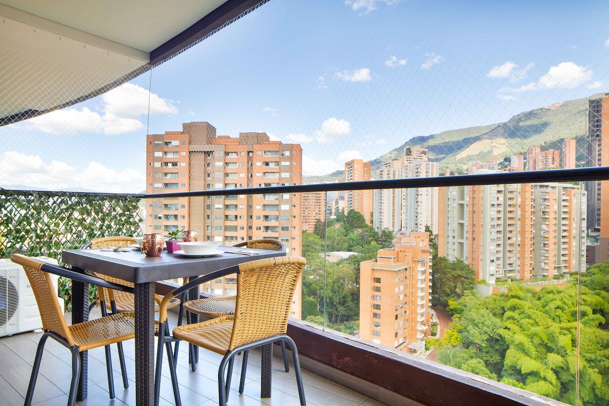 Razkošno predelano stanovanje v velikosti 70 m² v 9. nadstropju znamenite stavbe Energy Living. Odprite naša okna od tal do stropa in spremenite celoten bivalni prostor v zračen prostor na prostem z najboljšimi razgledi na obzorje Medellina. Vključuje zakonsko posteljo (King), dva 80-palčna televizorja in elegantno sodobno zasnovo. Uživajte v neskončnem bazenu na strehi, telovadnici in masažni kadi v 22. nadstropju. Nahaja se 5 minut od sosesk Provenza in El Tesoro. Varno, tiho in odlično povezano.