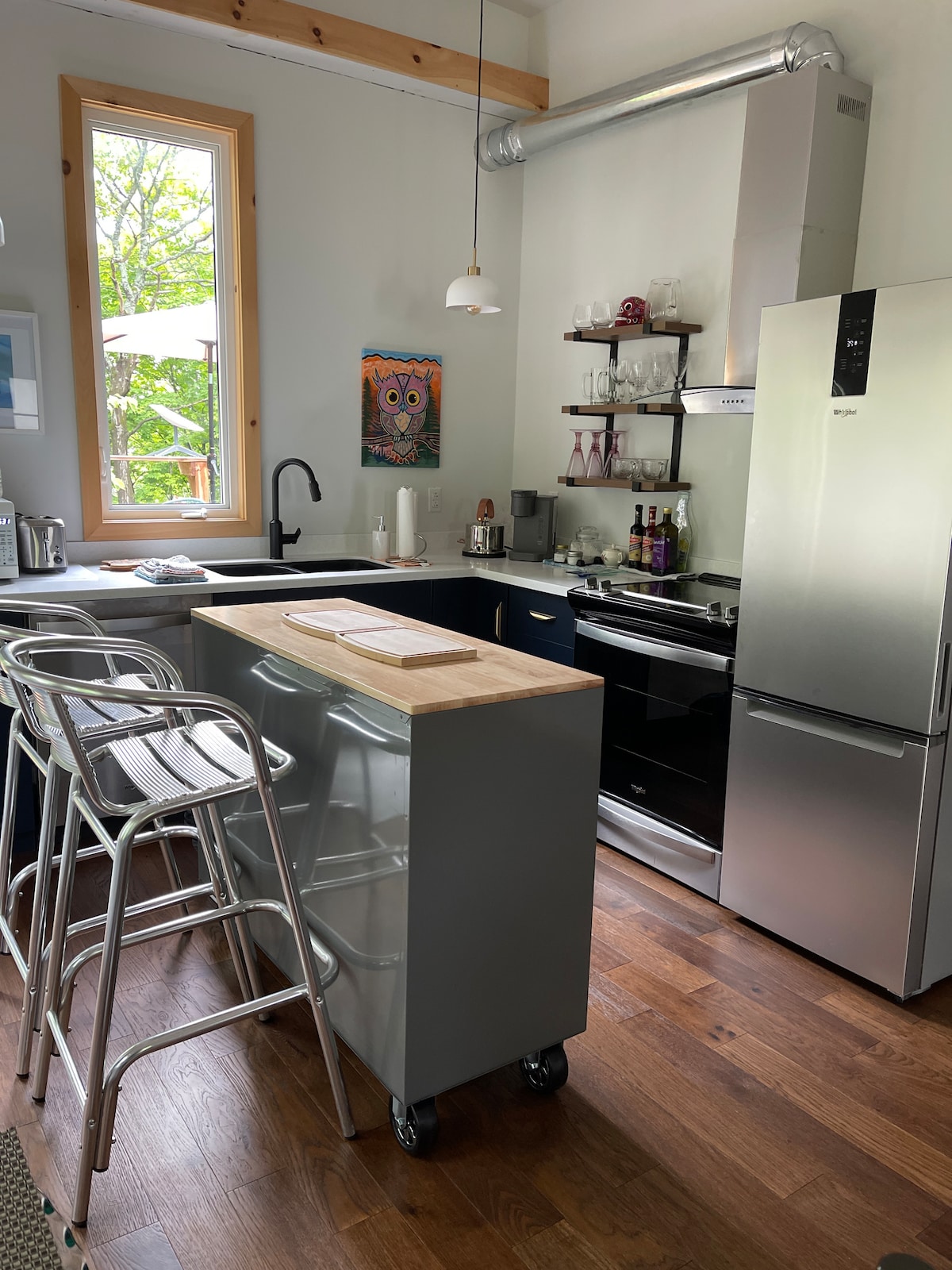 The loft hugs you with its warmth from the moment you walk in the door. High-end amenities and well designed space will allow you to enjoy the peace of the island from the comfort of this tranquil get-away. Of our 8 cabins, this the only one not direction on the water. We provide access to the water on the shared dock. It does, however, have stunning views as it's up on the hill.