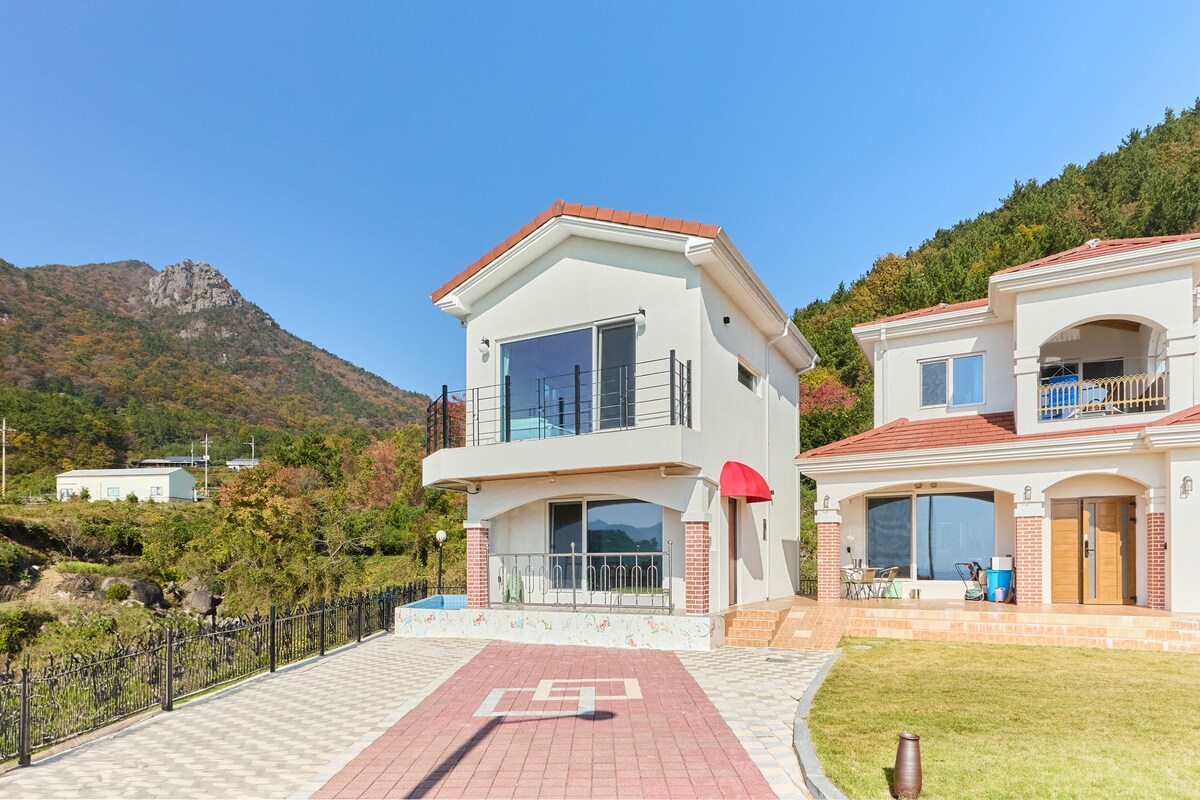 Sodobna modelska hiša H. Dannyja Kima (načrtovanje in gradnja). Čudovito prenočišče na jugu. Širok pogled na ocean, podoben jezeru, na Tomari Hillu na otoku Namhae. Oprema za žar in velika kopalnica pod vrtnim kotom Kazabo Uživajte v ognjišču (drva lahko pripravite) Čudovit sončni vzhod, ob večerji si oglejte sončni zahod Ogledate si ga lahko na dvorišču. To ne gre za redno penzioniranje ~ ^ ^ Gre za podeželsko razkošno hišo, specializirano za družine. Tujci so dobrodošli * * Do 6 oseb, vključno z otroki * * * * Psi niso dovoljeni * *