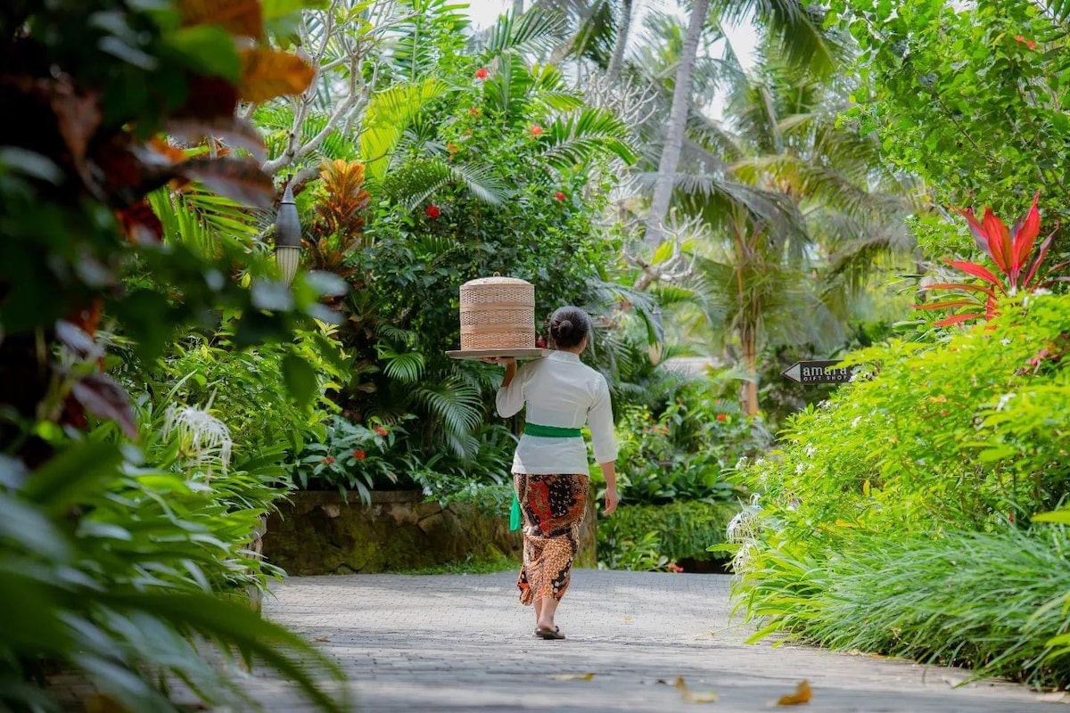 Unwind in this serene boutique stay nestled deep in lush jungle surroundings, just 10 minutes from Ubud city centre. This private jungle apartment feels as if it floats above the river, surrounded by treetops and nature. A spacious outdoor living area invites you to relax, work, exercise, or simply listen to the river below. The bedroom is fully enclosed for comfort. Meals can be ordered from the on-site restaurant. A village walk leads to a local waterfall for an authentic Bali experience.