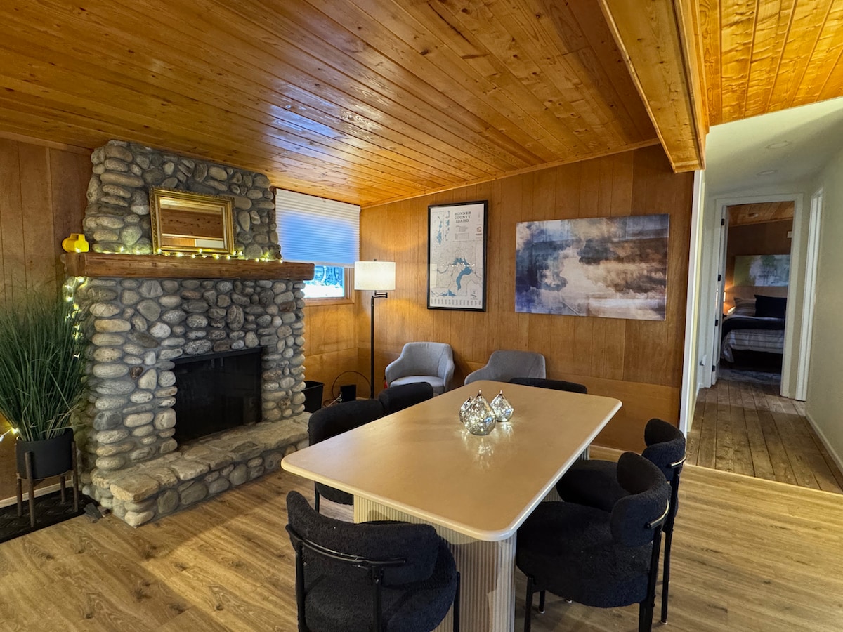 Udoben umik v obliki črke A, pritrjen na vrh skale z očarljivim razgledom na jezero Pend Oreille in gore na območju Sandpoint. Le 4 milje od središča mesta in 5 minut vožnje do prevoza Schweitzer. Ta intimna garsonjera s predelanim stanovanjem je raj za pare. Sprostite se v zakonski postelji, pripravite obroke v granitni kuhinji in uživajte v prhi po meri z ogrevano straniščno desko in bidejem. Uživajte v drugi sodobni opremi, kot sta hiter Wi-Fi in klimatska naprava. Zasebnost na koncu ceste.