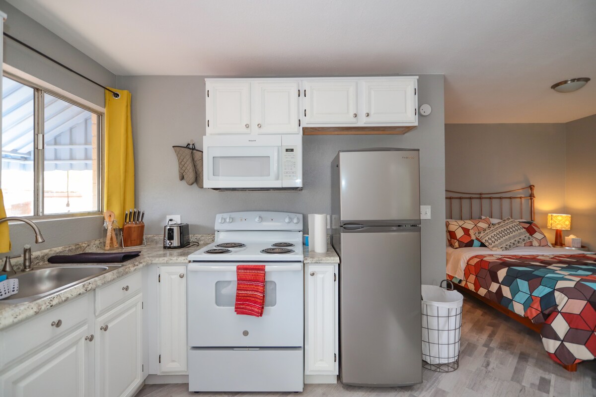 Udobna in očarljiva, ta zasebna hiša za goste se nahaja v osrčju Tucsona in je popolno izhodišče med vašim obiskom jugozahoda! Studio je prostorna in sproščujoča za 2 osebi. Popolnoma opremljena kuhinja, kopalnica s prho, vzmetnica z gostiteljico in udoben delovni prostor/hiter Wi-Fi za tiste, ki delate na daljavo. Enostaven dostop do letališča, U of A, Saguaro NP, nakupovalnih in pohodniških poti. Šifriran vhod je pravi prepir, da pride in odide, brez skupnih ključev. Počivajte v Knestu!