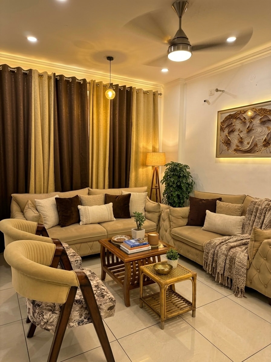 Doživite udobje in mir v tem minimalističnem 2BHK na VIP Road, Zirakpur. Premišljeno zasnovan z udobnim kotičkom za delo od doma, toplo osvetlitvijo in sproščenim sodobnim občutkom — kot nalašč za poslovne potnike, pare ali družine, ki iščejo mirno bivanje v bližini Chandigarha.