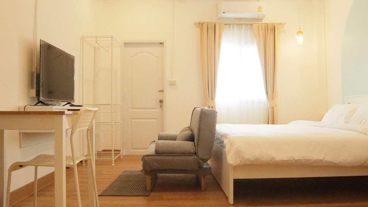 🌿Vzemite si oddih in se sprostite v tej mirni oazi. 🌟Primerno za počitnice in delo od doma. 💢Brezplačen Wi-Fi na vseh območjih 🏡Zasebna soba v nizkem slogu stanovanjskega letovišča z bazenom 29 m, telovadnica,jacuzzi, Suana, skupni delovni prostor, košarka, tekaška steza in igrišče 🏕Soba je za 1-3 osebe, opremljena z 1 zakonsko posteljo, ločeno dnevno sobo in kuhinjo. Wi-Fi, televizija, klimatska naprava, hladilnik, kotel, kompletna posoda, delovni prostor 🍲 5 km do letališča DMK in skytraina. Raznolika lokalna hrana je povsod po lokalni ceni.