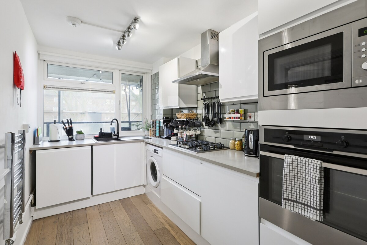 • 850 kvadratnih čevljev, preurejeno, 2 spalnici/1 kopalnica, dobesedno 10 čevljev od parka Weaver Fields. • Postelje iz pene: 1 super king (širina 180 cm), ena king (širina 150 cm) in 4 talne vzmetnice • Profesionalno očiščeno posteljnino, puhaste brisače in vso opremo, ki si jo lahko zamislite. • Wi-Fi (110 Mb/s), pametni televizorji, brezžični zvočnik, sušilniki za lase, ventilator Dyson, pralni stroj, sušilni stroj in kuhinja za kuharja. • Cevi: Bethnal Green (1 m hoje), Whitechapel (8 m) • Otrokom prijazno z otroško posteljico in visokim stolom • Ni dvigala, do stanovanja pa je treba po stopnicah.