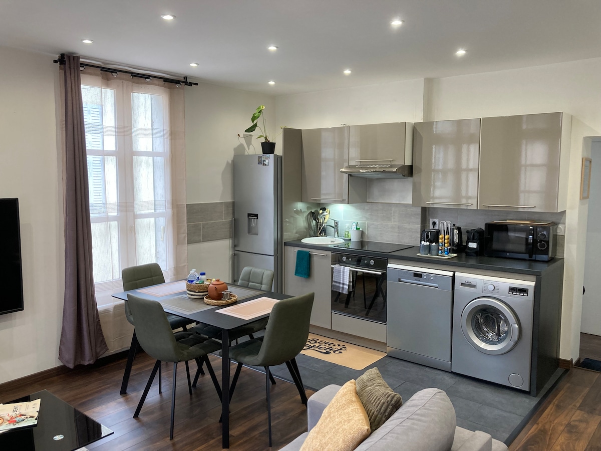 Prenovljeno stanovanje v zgodovinskem središču mesta Sens, le kratek sprehod do katedrale, tržnice in trgovin. Tiho in svetlo prenočišče ponuja udoben prostor z ločeno spalnico s steklenimi stenami, udobno dnevno sobo, delovno mizo in opremljeno kuhinjo. Sodobna kopalnica, pralno-sušilni stroj (skupni prostor), posteljnina je na voljo. Samostojni vstop, Wi-Fi. Enostavno parkiranje v bližini. Idealno za poslovno bivanje ali vikend za dva.