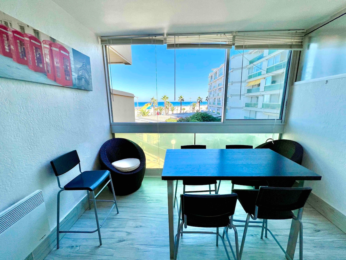 Joli studio face à la mer en première ligne. Résidence calme et bien entretenue. Proche de tous les commerces à pied. Plage à 20m. Studio climatisé, moderne et équipé avec couchage pour deux personnes. Terrasse. Cuisine équipée. Douche et toilettes séparées. Place de parking privée dans la résidence. Borne de charge 7kw privée. Wifi privé.