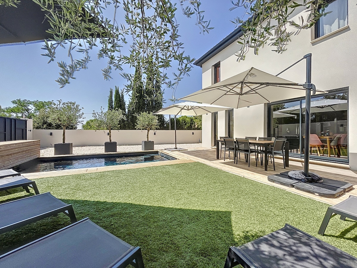 Mazanel is a recent designer Provençal villa, with high-end services, designed for holidays and relaxation. Breathtaking view of Mont Ventoux, trees and valley. Eco-designed (solar panels, heat pump, LED, good thermal isolation…). Entirely on one level (ideal for people with reduced mobility). Air conditioning. Large swimming pool private (not shared), secured by an electric roller shutter. Large terrace, partly covered. Deckchairs, garden tables, gas barbecue, garden.