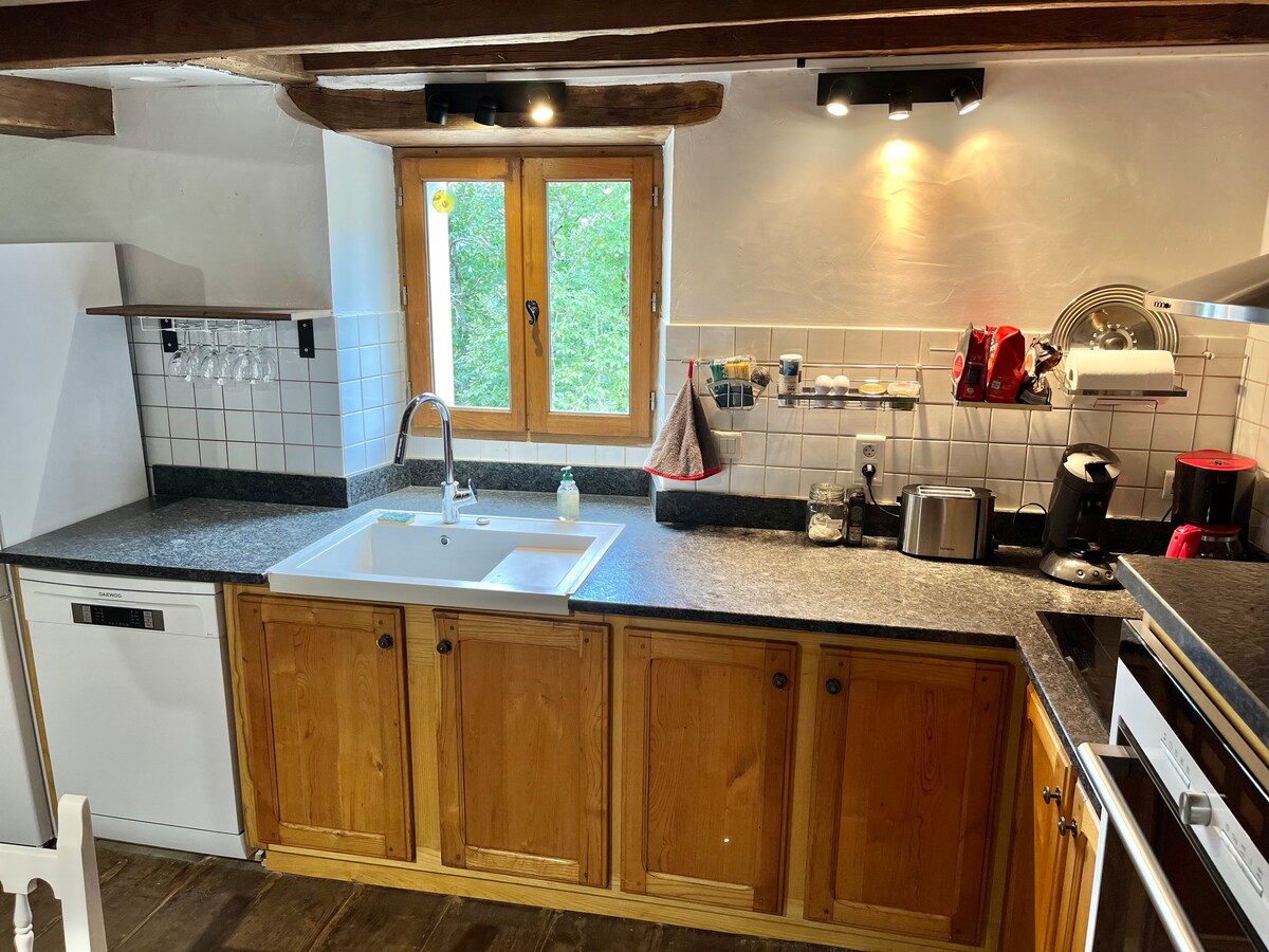 Dans un cadre idyllique, maison de montagne retapée au goût du jour. Au rez de chaussée vous serez séduits par deux chambres avec une salle de bain ( douche et wc) une cuisine ouverte sur le salon avec un poêle à bois. A l’étage se trouve le dortoir de 6 personnes ( 6 petits lits simples) ainsi que salle de jeux et un lit double situés sur la mezzanine. Une salle de bain est également située à l’étage . Nous occupons la maison d à côté et sommes à votre disposition