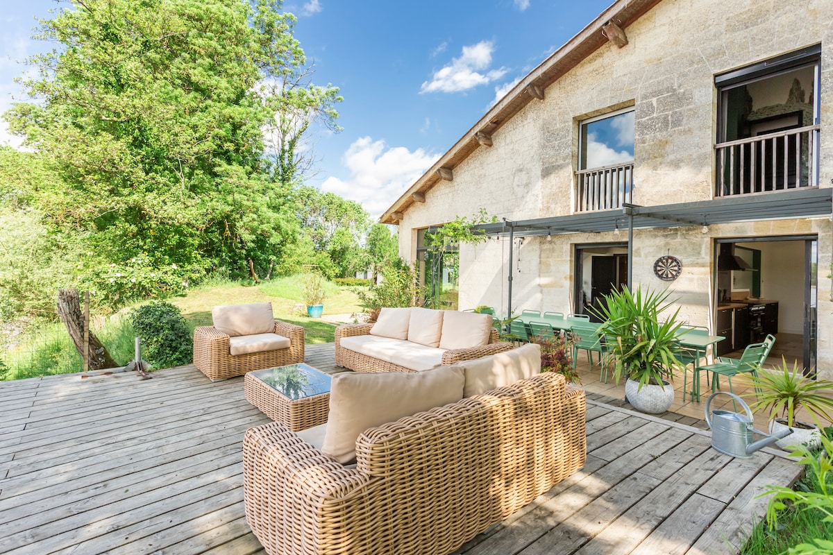 Naša skrbno prenovljena kamnita hiša, ki se nahaja v osrčju stare vinske kleti iz 17. stoletja, vam ponuja izjemno sproščujoče bivanje. Uvrščena je kot »4 ZVEZDICE« in združuje čar stare kamnite hiše s sodobnim udobjem. Lahko se umaknete, sprostite na permakulturnem vrtu ali pa se potopite v živahne soseske Bordeaux. Sosednji vinski gradovi (Fronsadais, Pomerol, St. Emilion itd.) vas vabijo, da poskusite njihova vina.