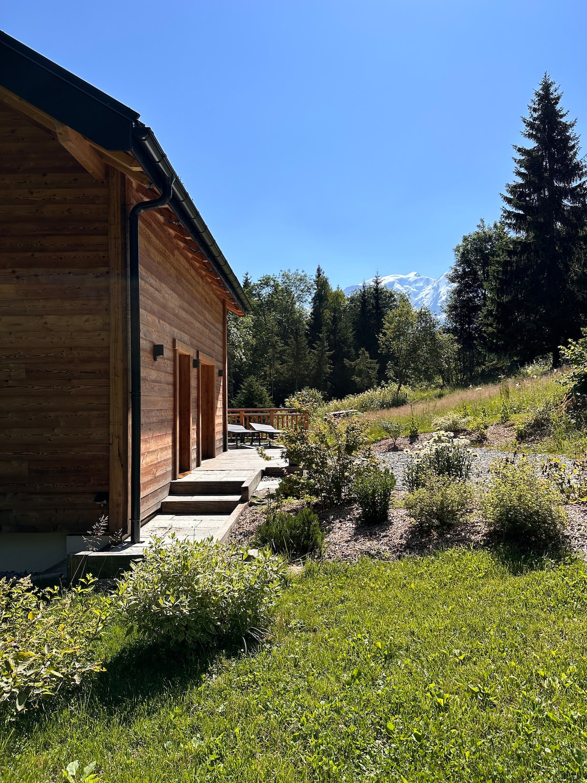 modern chalet, 2 double bedrooms and a sleeping alcove ,2 shower rooms, a fully equipped kitchen. whole house, garden and carport for 2 cars. at the end of a quiet road, close to buses (100 meters), trains , and the center of Les Houches(10 mn walking), les Houches ski resort ( 5 minutes) and all the chamonix resorts (20 to 40 minutes). It’s next to the village ski slope, which leads down to a skating rink. A free evening ski and show take place every Thursday during the winter season.