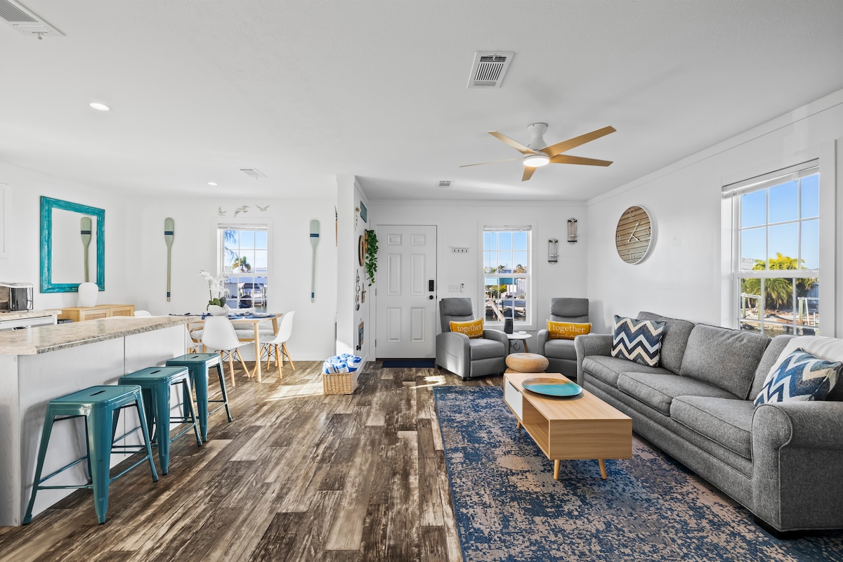 Posodobitev: septembra 2022 nas je prizadel orkan Ian. V naši cenjeni hiški smo imeli nekaj več kot 5 čevljev poplav. Neumorno smo delali, da bi vse skupaj pripravili. Vse nove ploščice, stene, elektrika, razsvetljava, pohištvo in celo izboljšali smo kopalnico! Prostorno tropsko prenočišče s pogledom na vodo z našega dvorišča Lanai. Boat Dock with Cleaning Fish Station, BBQ beautiful sunsets with fish jumping in our canal. Nova velika kuhinja in eno ulico stran od umetniških galerij, restavracij in barov.