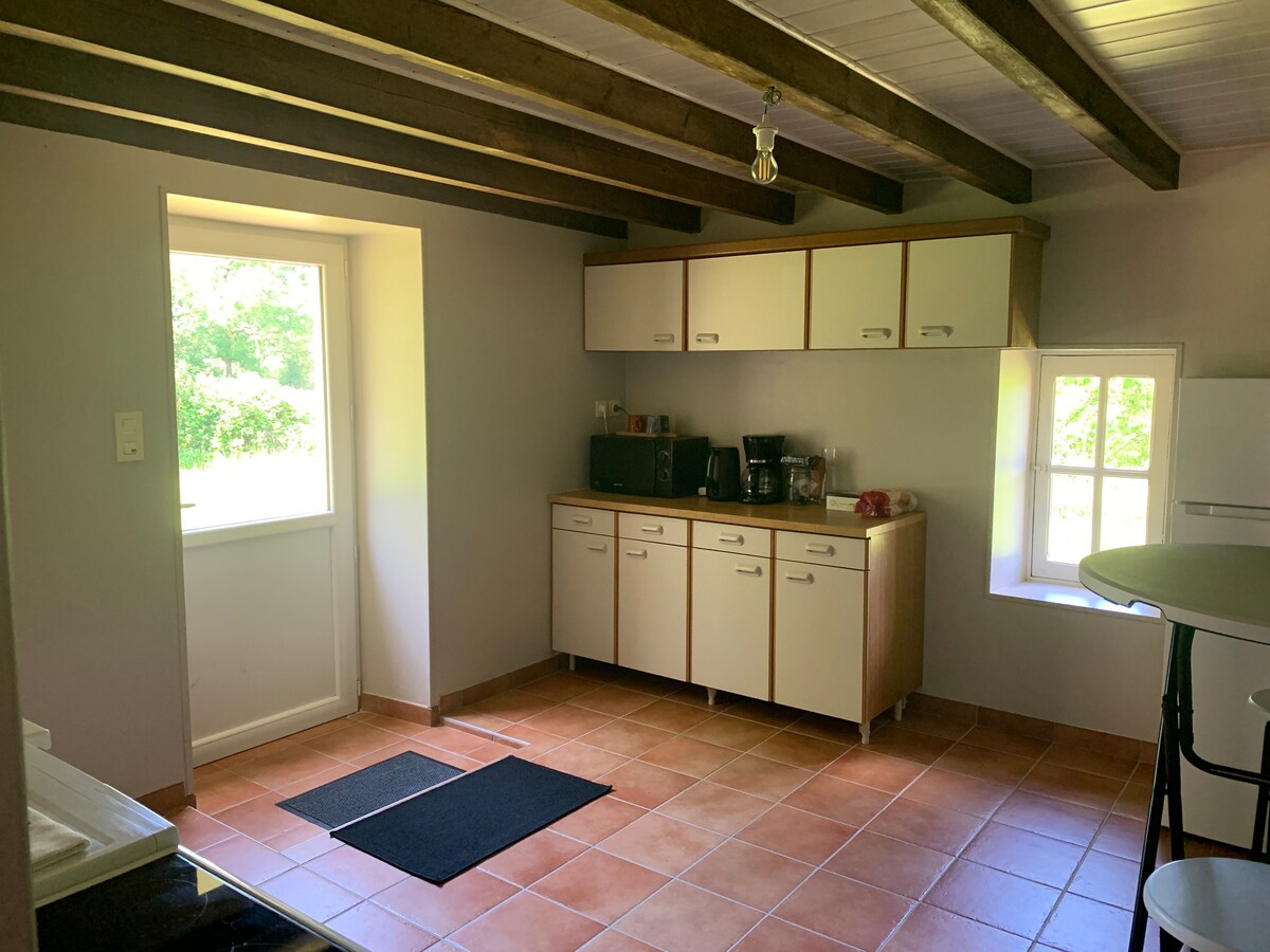 Si vous aimez les animaux, le calme, la nature. Bienvenue chez nous ! A 35 min du Puy du Fou, de Mervent, du marais Poitevin, à 1h des côtes vendéennes. Idéal pour 2-4 pers., 4 couchages max. Au RDC, cuisine équipée avec TV/banquette, une SDB et WC. A l'étage, CH avec lit de 140, une 2éme CH avec canapé convertible confortable de 140. Escalier pentu. Terrasse privative avec cuisine extérieure, plancha à disposition. Accès coin jardin avec relax. Une place de stationnement.