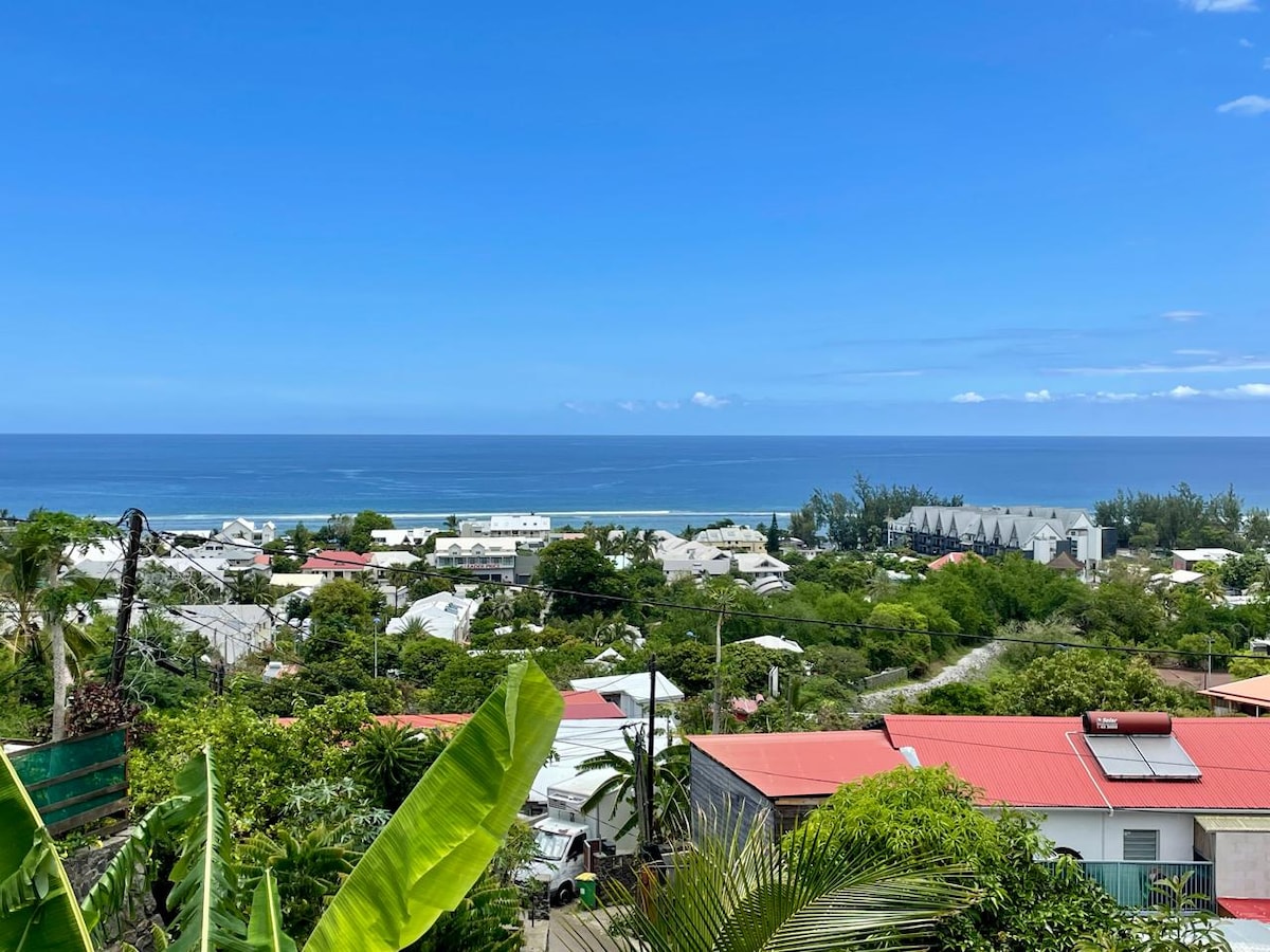 F2 de 35 m2, plein pied avec une chambre lumineuse climatisée, vue sur la piscine et l'océan (literie neuve en 160), une salle de douche, toilettes séparés, cuisine dînatoire, varangue couverte de 20 m2 avec vue sur l'océan. Le logement est accolé à la maison du propriétaire mais avec entrée indépendante. Vous aurez accès à la piscine privée. Logement situé chemin Summer à St Gilles les Bains , à 15 min à pied de la plage des roches noires. Possibilité de garer son véhicule devant la maison.