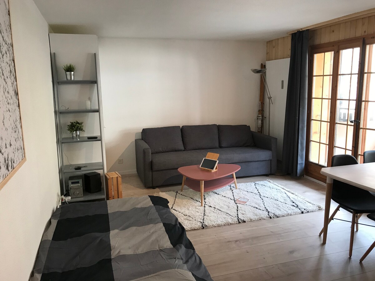 Veličastno stanovanje, vključno z 1 spalnico z zakonsko posteljo, dnevno sobo z udobnim raztegljivim kavčem, kuhinjo in kopalnico. Lepa terasa, zelo sončna. Jacuzzi in savna. Zasebno parkirno mesto ob vznožju planinskega doma. Liberty-pass za 2 osebi od konca maja do začetka novembra (brezplačni avtobusi, tenis, bazen in več kot 20 brezplačnih dejavnosti! 50% znižanje žičnic) Novo: terminal za polnjenje električnega avtomobila.