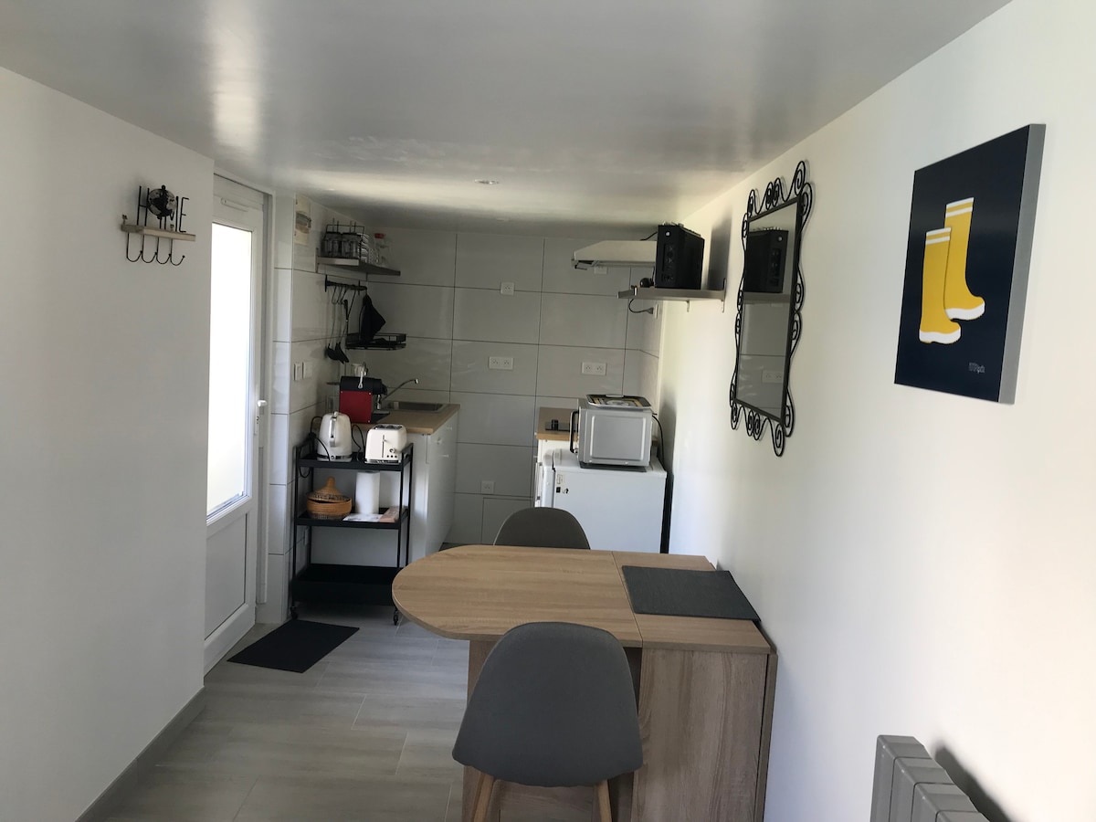 Nov studio se nahaja 800 metrov od vasi Paramé, manj kot 2 km od velike plaže St Malo (brazda, skala) Dnevna soba z raztegljivim kavčem 140 x 200 blazin, prešito odejo in zaščito za vzmetnice (dovolil vam bom, da s seboj prinesete rjuhe in brisače. Hvala )