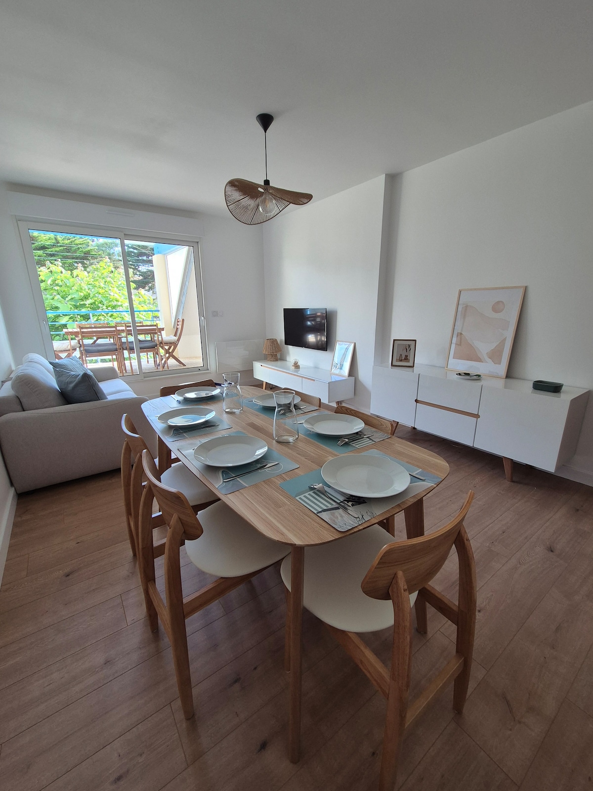 🌊 Près de la mer, studio entièrement aménagé et équipé avec une cuisine : four, plaque, hotte, micro-ondes, lave-linge, ainsi qu'une table pliable et légère pour un gain de place optimal 🍽️. Le salon dispose d’un lit queen size 🛋️ et d’une TV écran plat 📺. La salle d’eau est moderne avec douche à l'italienne 🚿, meuble vasque et WC 🚽. Une place de stationnement est incluse 🚗. Le logement est situé dans un éco-quartier 🌱.