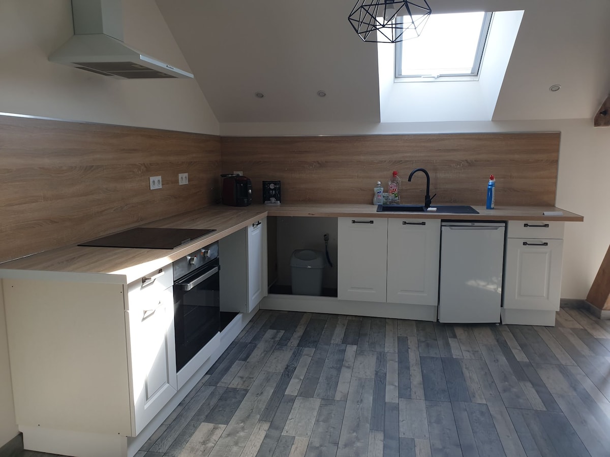 49 m2 velika hiša za goste. Prilagodljiv prihod. V 1. nadstropju velike kmečke hiše v slogu Gâtinaise. Na 3000 m2 gozdnatega zemljišča in kokošnjaka. Skupno zemljišče z našim frizerskim salonom in domom. Nastanitev je skoraj v celoti opremljena... Prha + kopalna kad 🛁 Aparat za kavo Senseo Mini hladilnik...