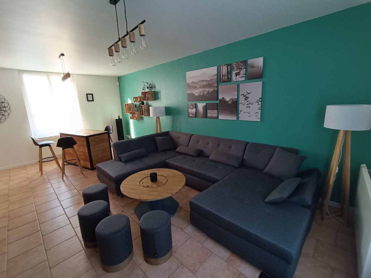 Očarljiva polmerna hiša velikosti 60 m², ki se nahaja na podeželju. Odličen kraj za polnjenje baterij v tišini in zelenju Podeželska dekoracija in zelo popolna oprema Postelje so pripravljene ob vašem prihodu Možen samostojni vstop Trgovine in restavracije, dostopne z avtomobilom Posebej zasnovano za bivanja, ki trajajo od nekaj dni do več mesecev Novo: hiša je zdaj znana po Fiberju, ki vam omogoča, da delate v dobrih razmerah