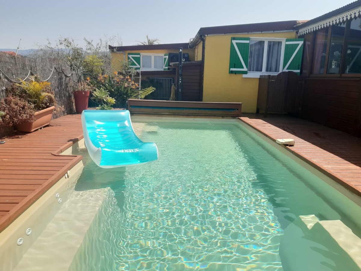 Udobna lesena hiša na odlični lokaciji za odkrivanje juga otoka. Prostorna in udobna za 4 osebe: 2 spalnici, dnevna soba, dnevna soba, kuhinja, velika terasa in vrt. V bližini vseh trgovin peš in glavnih cest. Nahaja se na 400 m nadmorski višini, idealno v Réunionu. St Pierre (10 min) , divji jug, vulkan (1 ura), zahodne plaže (45 min). Moje bivališče je primerno za pare, samostojne popotnike ali poslovne popotnike, vendar ni primerno za otroke, mlajše od 12 let.