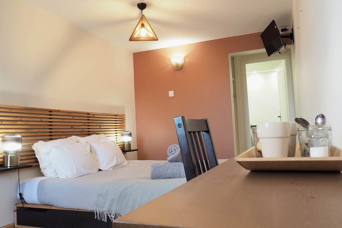 Veliko dvosobno stanovanje BREZ SKUPNIH PROSTOROV (kar prej ni bilo tako). Klimatizirana soba v nadstropju s hamamsko prho (parna kopel), postelja Emperor (2 x 2 m) v starem obnovljenem hotelu, zaseb zasebni salon, v središču puščavske vasi Rochefort-Montagne. spalnica: 2x2m vzmetnica na letvenem okvirju, aparat za kavo Senseo, grelnik vode in majhen hladilnik. Na voljo so rjuhe/odeje/brisače, Wi-Fi v vsakem nadstropju, Velika kuhinja v pritličju, dnevna soba, Android TV.