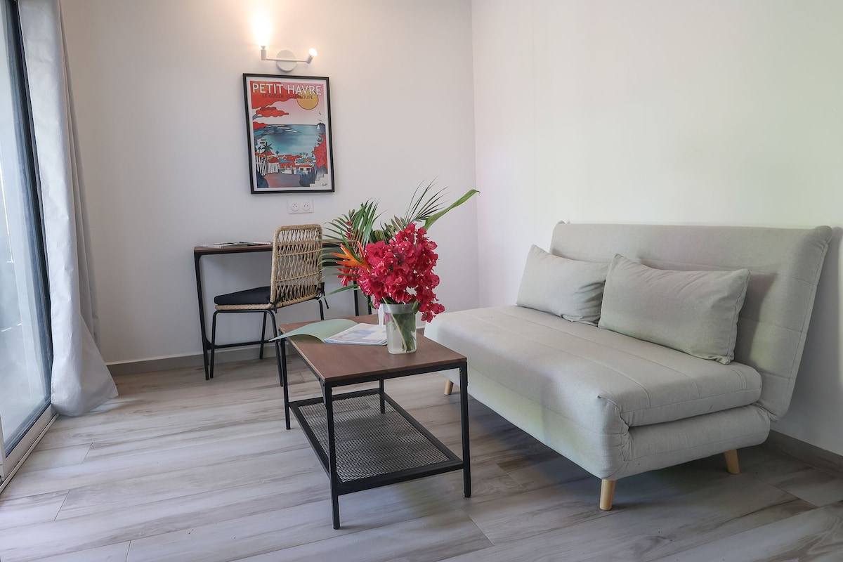 Welcome to the Serendipity Suite! Entirely designed and recently renovated (Dec. 23) to offer you all the comforts you need, this is an invitation to relax. We will be pleased to offer you a welcome cocktail and 2 breakfast vouchers (except between 25.08 and 25.10) The Suite is located in the heart of the Anse des Rochers residence, on the 2nd (top) floor of Le Flamboyant, overlooking the palm grove, between the pool and the beach. This appartement is for 2 people and 1 child (-10 years old)