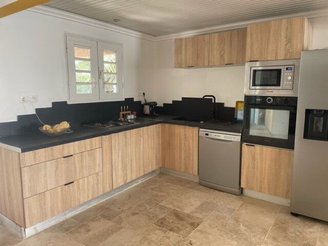 Očarljiv nov planinski dom v lesu, ugnezden v zelenju, 7 minut hoje od plaže Anses d 'Arlet. Imate veliko spalnico s čudovito sosednjo kopalnico in veliko prho ter garderobno sobo in pralni stroj. Na veliki terasi se nahaja kuhinjski prostor (sodoben in popolnoma opremljen) in dnevna soba s pogledom na vrt. Majhen razgled na morje s terase. Izjemne razmere v polni svežini, sadnih drevesih in majhni reki. Edinstven kraj!