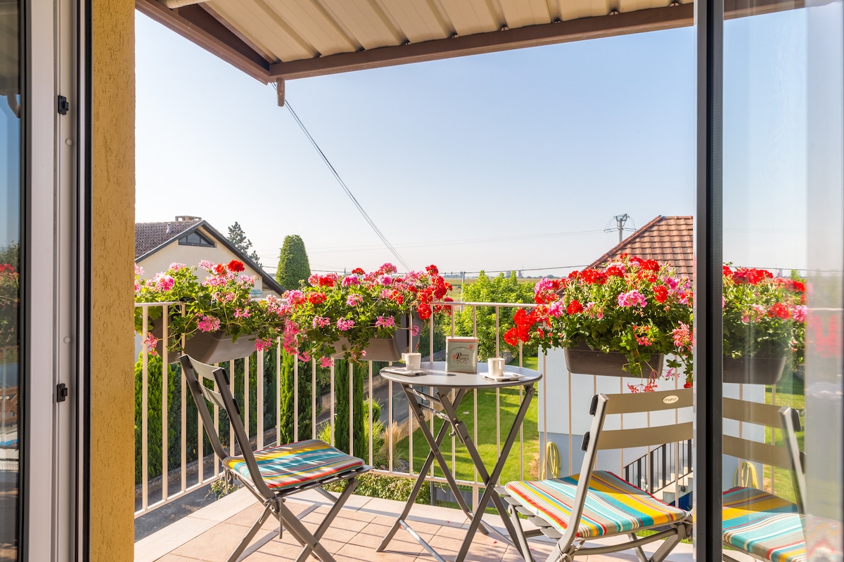 Stanovanje se nahaja v 1. nadstropju samostojne hiše, na zasebnem dovozu stran od prometne ulice. Zelo mirna stanovanjska soseska. Bližina najlepših vinske poti (10 min od Eguisheima, 10 min od Colmarja, 20 min od Kaysersberga, Riquewihrja ali Ribeauvilléja), pa tudi 15 min od Nemčije, 25 min od letališča Basel, 45 min od smučišč in pohodniških poti na dolge razdalje ter najlepših božičnih tržnic.