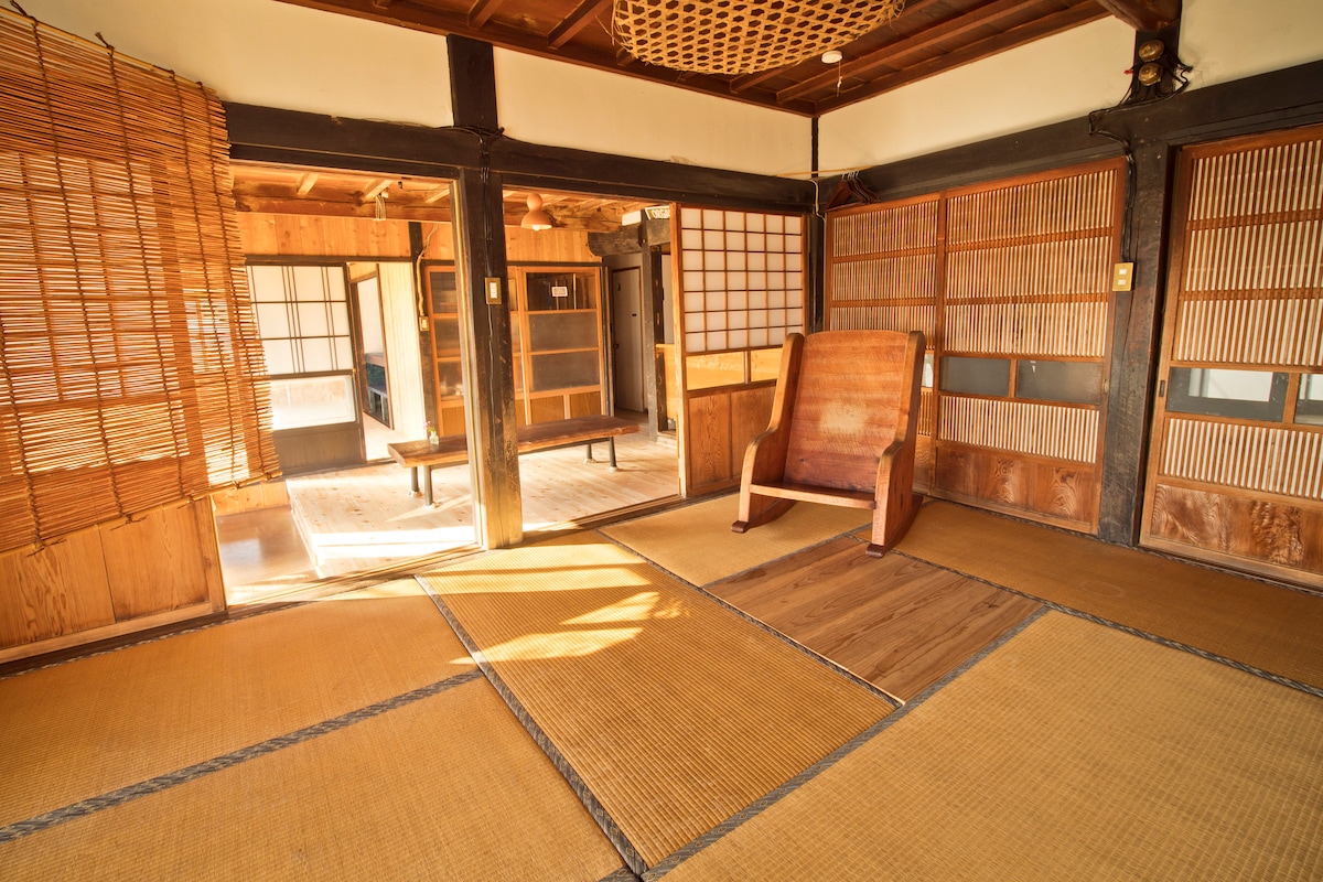 Celotna stara hiša je samo za dve osebi. Preživite čas z družino, sorodniki in prijatelji. Uporabite ga za delo na daljavo. Snemanje, distribucija, vadbeni tabori, predavanja in študijske seje. Poskrbeli bomo za vaše različne potrebe. Spomladi in jeseni se lahko sprostite na hodniku verande. Poleti lahko začutite, kako vetrič piha, in zadremate na tatami preprogi. Pozimi je ogenj sproščen s štedilniki na drva in kamini. Kuhajte v kuhinji, kjer lahko kuhate za večjo skupino. Obstaja veliko načinov za zabavo. Mirne reke in bregovi, sezonsko cvetje, Riževa polja, prostrano modro nebo, briljantne lune in zvezde, Čisto bele jutranje brtenice, sončni vzhodi in zahodi z zemlje, Tihi časi, sosedje. Skrivnostna zgodovina in dediščina labirinta vasi. Uživate lahko v njih. Ličila, branje, meditacija, delo na računalniku itd. Na voljo je tudi ločena kontejnerska hiša. Ni hrupa, kot so trgovine, prodajni avtomati, znaki itd. Trgovine, supermarketi in obcestne postaje so zelo blizu z avtomobilom ali kolesom. Objekti s termalnim vrelcem in okusne trgovine so oddaljeni 20 minut vožnje. Na voljo je tudi sprednji izhod in miza za žar. Kuhanje, štukature in doživetja pri pripravi riža v kaminu so prav tako na voljo proti plačilu.