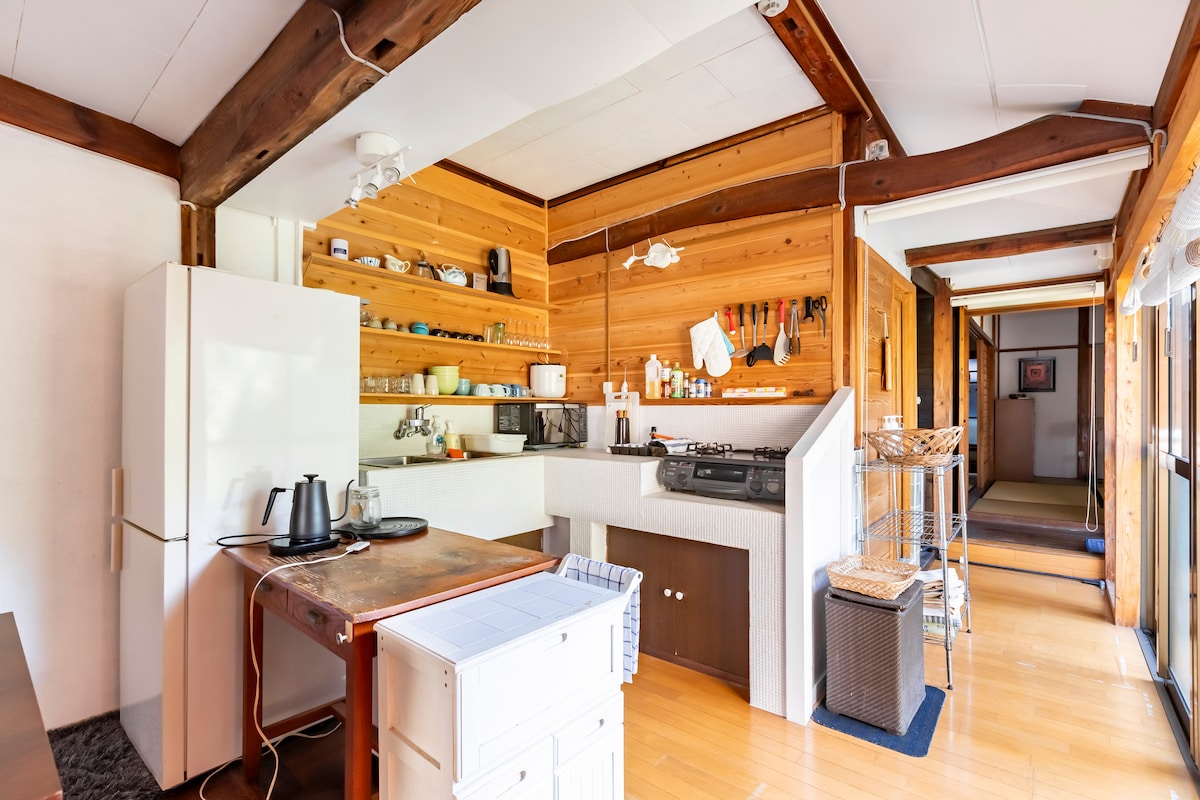 Zunanjost ima kontrast ometa in pečene cedre, prostoren, pomirjujoč prostor pa ima dišeča, čista lesena tla in tatami preproge.V celoti je opremljen s potopljenim kotatsujem, 1-tsubo kadjo, umivalnikom, sistemsko kuhinjo s pomivalnim strojem in še več.Zbudite se ob jutranjem zvoku ptic in ponoči uživajte v zvezdnatem nebu, razkošju, ki je edinstveno na podeželju. * To je sestrska gostilna »Folksy House« in »Miu house«. Na voljo sta tudi★ angleščina in kitajščina, da lahko gostje iz tujine bivajo brez skrbi. Ni parkirišča za★ velike avtomobile (avtodome, tovornjake itd.).