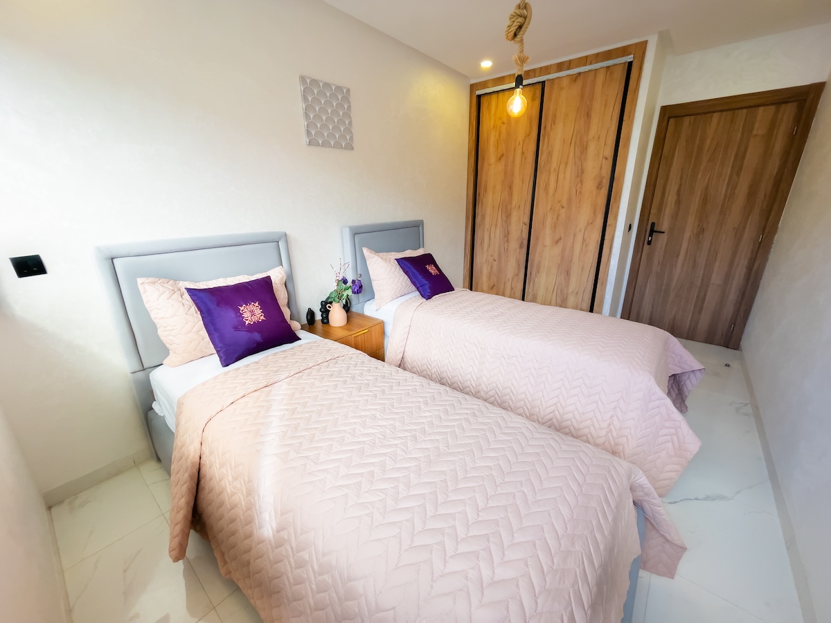 Zelo lepo stanovanje, razvrščeno med 3 najboljša stanovanja na plaži držav z 2 spalnicama v dnevni sobi v vodi z zasebnim vrtom, vključno z 2 velikima terasama, dobro opremljeno, osupljivim pogledom na morje, neposrednim dostopom do bazena, vogalom in plažo na 1 min , zasebnim garažnim prostorom, zelo varno bivališče, ki se nahaja približno deset kilometrov od flap in kenitra. To je popoln kraj za vas in vašo družino, da uživate v počitnicah.