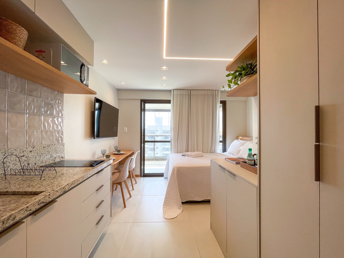 Olá, a acomodação é no formato de estúdio, com cama de casal + uma de solteiro, SMART TV 42', cozinha com frigobar, fogão de indução, microondas, cafeteira e diversos itens para uma estadia confortável. Quase todos os equipamentos e mobiliário são novos. Situado na principal região empresarial da cidade. Está a alguns metros do Shopping Salvador. CHECK-IN: a partir de 14h. (Caso precise checkin antes de 14h consulte disponibilidade) CHECKOUT: MEIO DIA * 1 vaga de garagem